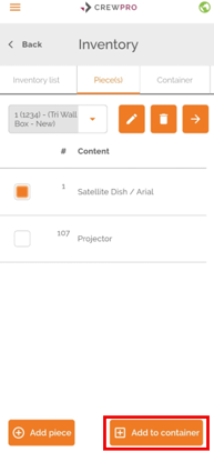 Once the container is created, go to the "Pieces" section and select the pieces that should go inside it. To do this, use the dropdown at the top of the screen to select the piece, then click on "Add to Container" located at the bottom right corner of the screen.